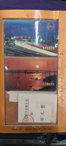 1997年番禺市公共汽车IC卡首发纪念册,一套2张,带原装发*票,全套未拆封,外册有微损,纪念卡品相完整。卡面有番禺大桥、公交车等主题,收藏纪念意义。适合公交卡、纪念卡、广东地方票品收藏。