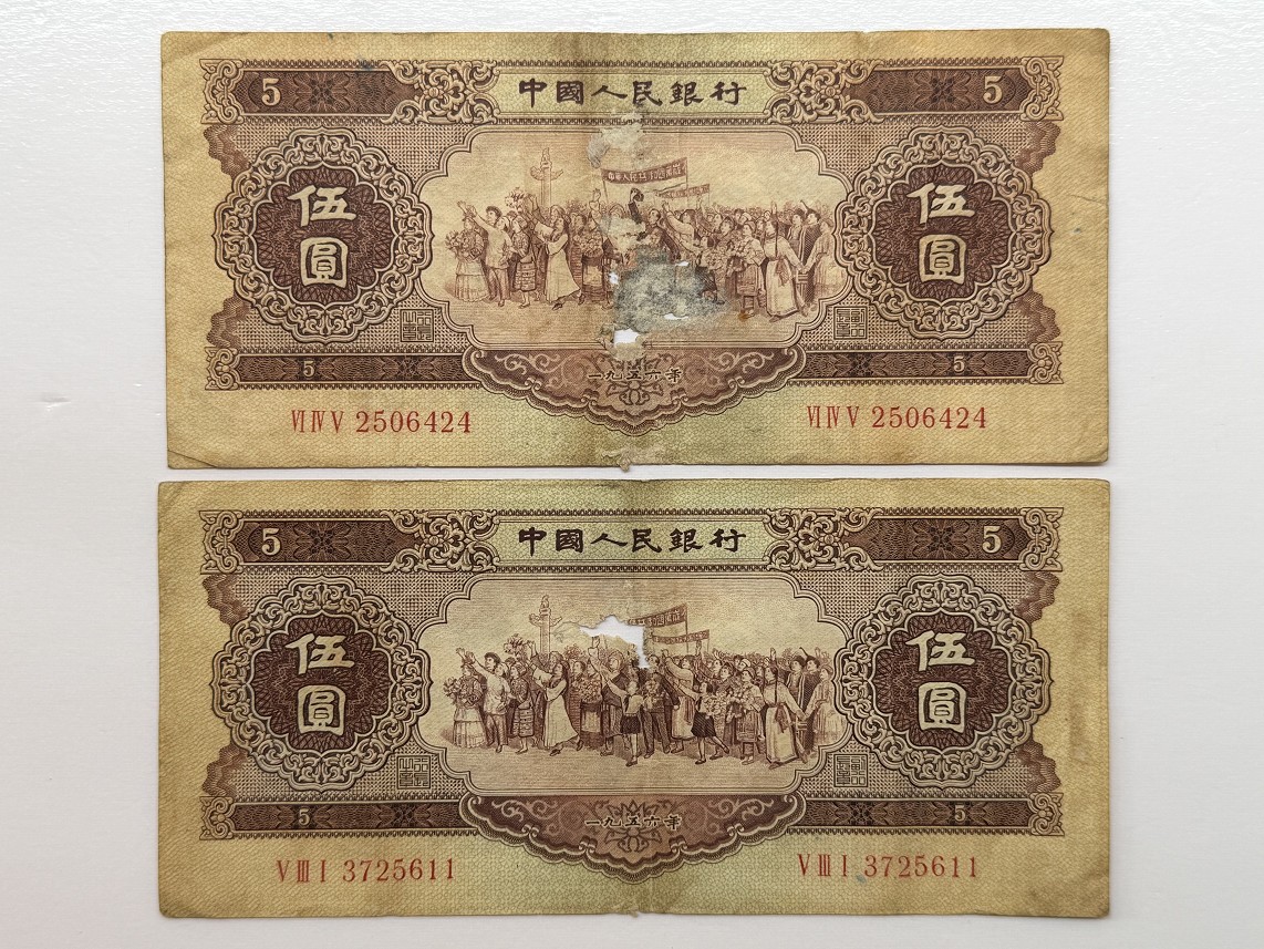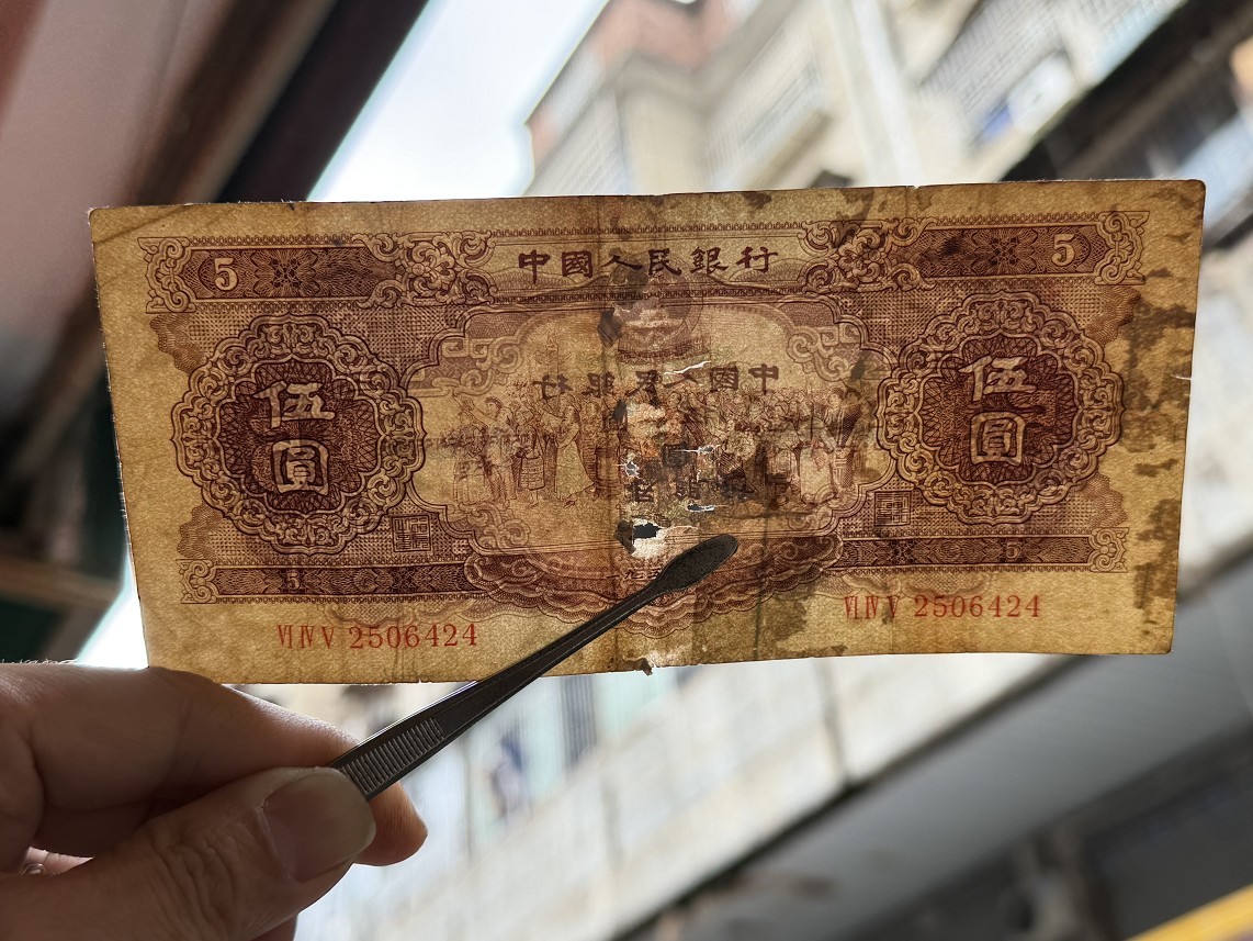 3、第三张黄五,号码2506424,5品左右,中间有孔,透光,如图,200;