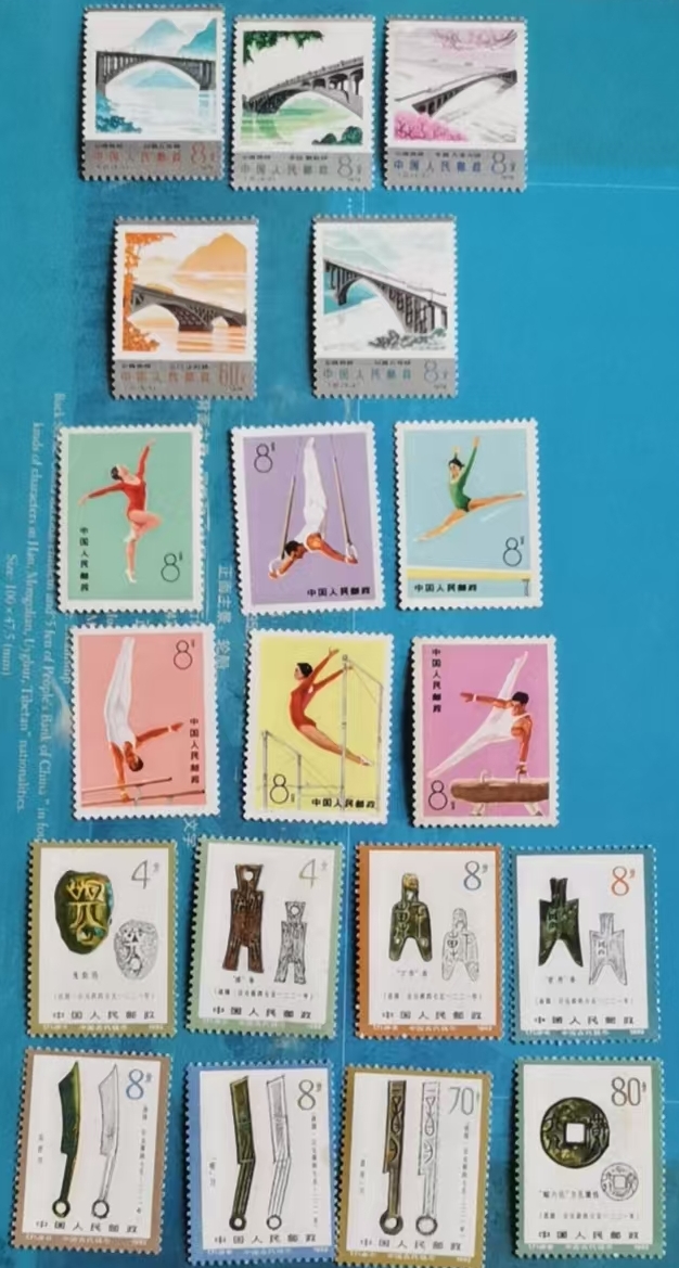 拱桥-1-2-3黄明显,体操-6原胶,其它无胶,币二-5无胶,80分票面有斑明显,个别票面微斑。未说明的都原胶微黄,三套一起165包挂。