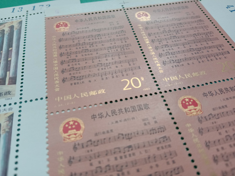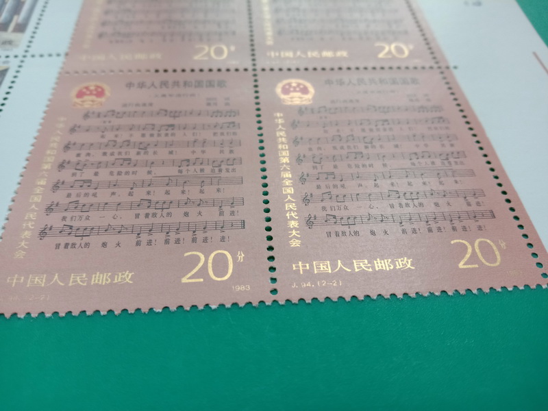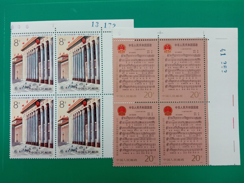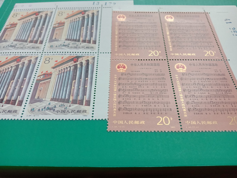 J.94六届人大右上直角,边纸齿孔无折,票面干干净净,背胶雪白,千足金粉铮亮无氧化,紫光灯下无白斑。适合极端挑剔的藏家。