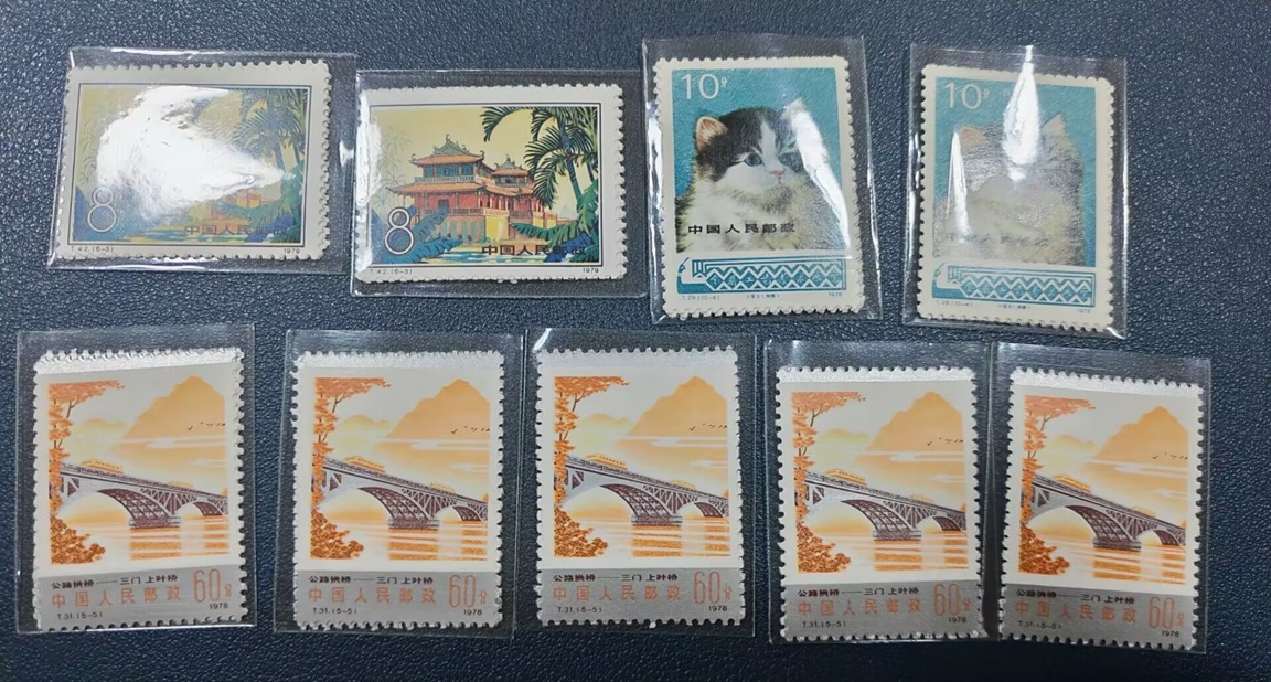 除拱桥有两三枚背面轻微暗黄,其它都是原胶全品,拱桥银亮