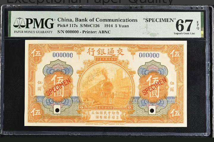 → 民国三年交通银行五元票样冠军分,唯一仅见桔色最高分