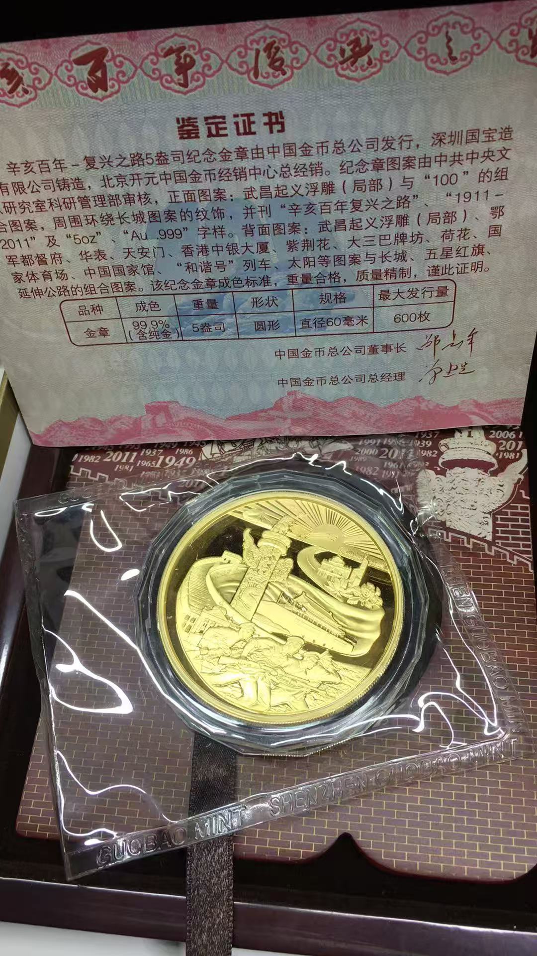 → 出发行只有600枚的辛亥百年复兴之路5盎司金章,原盒原证,金币总公司发行,证书0255