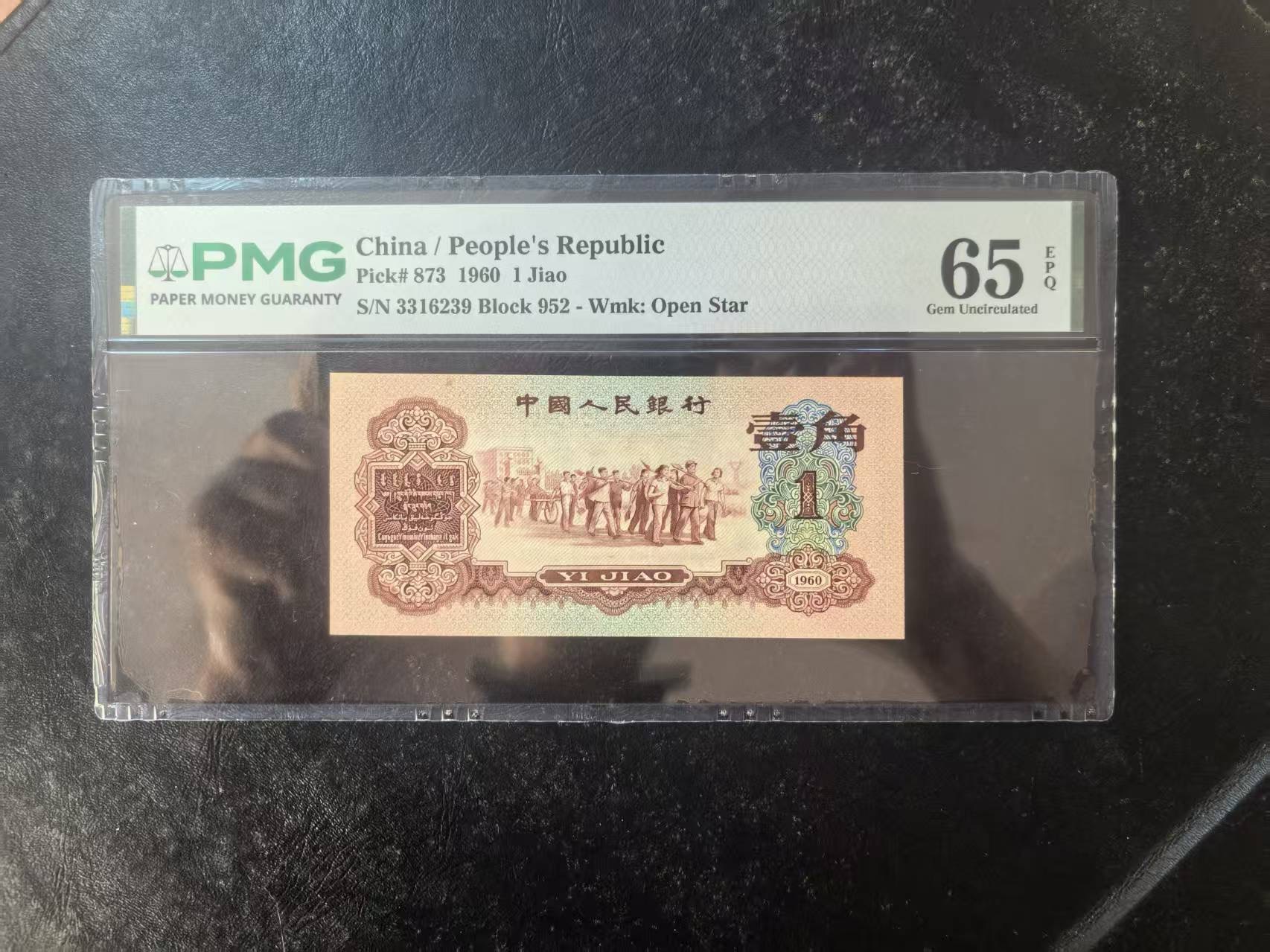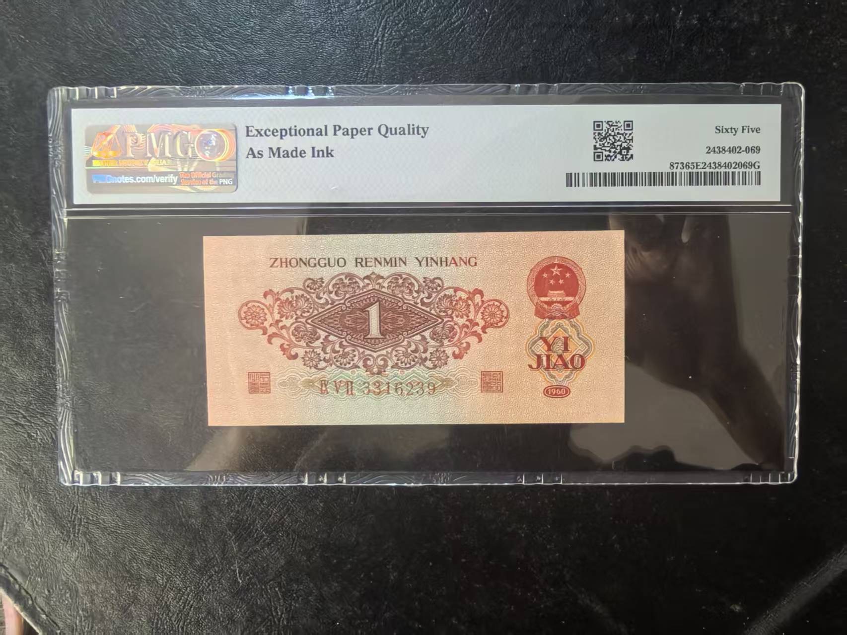 三版枣红1角美评PMG65E主流靓号无47,正面左上方带原始墨迹,少见趣味品种,售价5380包顺丰