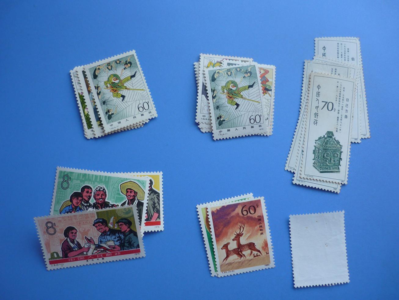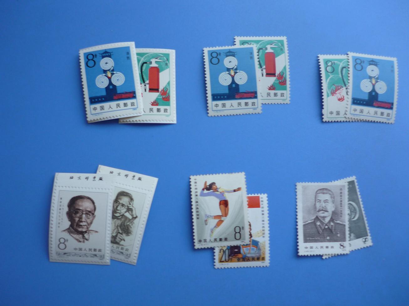 西游左面一套二胶做得不错,无黄200,西游右面一套原胶微黄,个别有霉点190,干校-1无胶,其余两枚原胶微黄近全品56,梅花鹿-2无胶有折,其余两枚原胶微黄24,青铜原胶微黄,均有明显软折60,消防左面一套原胶无黄,贴在纸上,消防中间一套原胶微黄揭薄,消防右面一套原胶微黄无其他问题,三套一起8,郭沫若名裁不折,无黄,贴在纸上4,女排原胶有黄,-1正面红油点,-2背微脏4,斯大林无胶4,中美名无折裁,原胶无黄,正面有戳印,不明显,非信销60