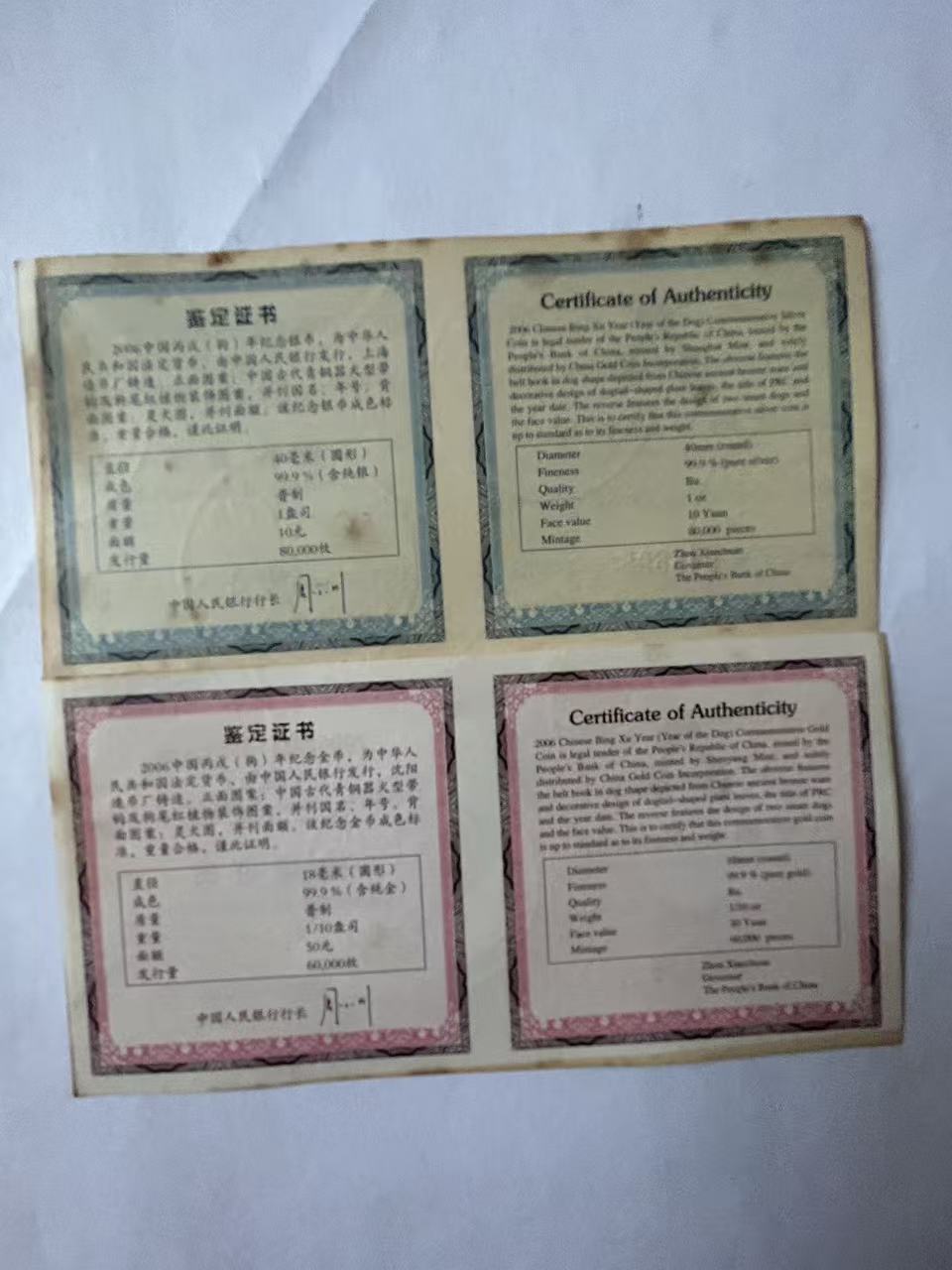 → 售06年狗金银币一套
