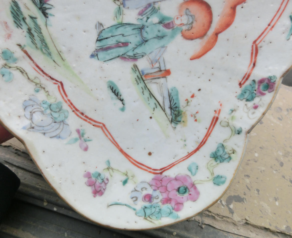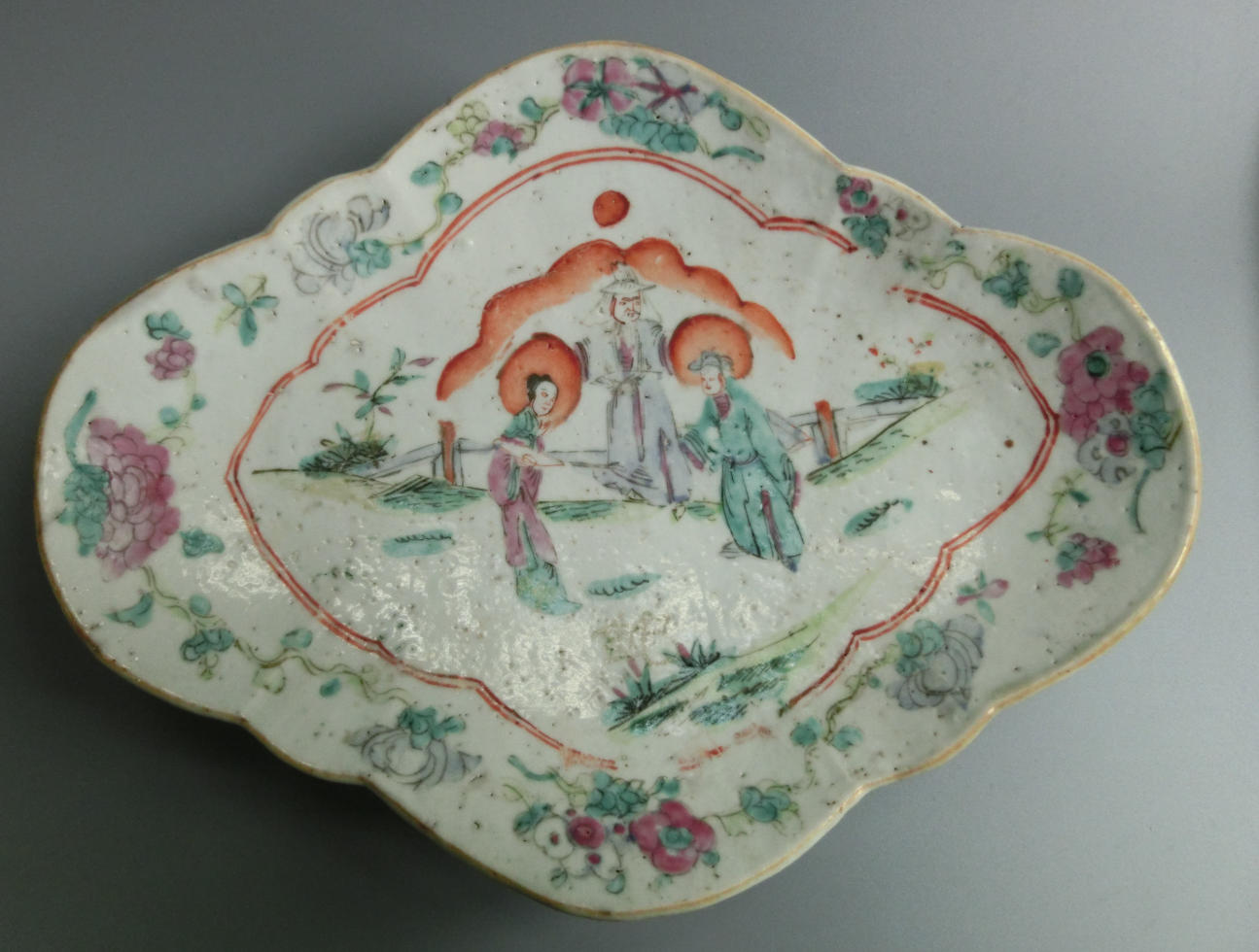 传世美品、造型雅致、清中期神话人物花卉粉彩瓷鸭舌盘