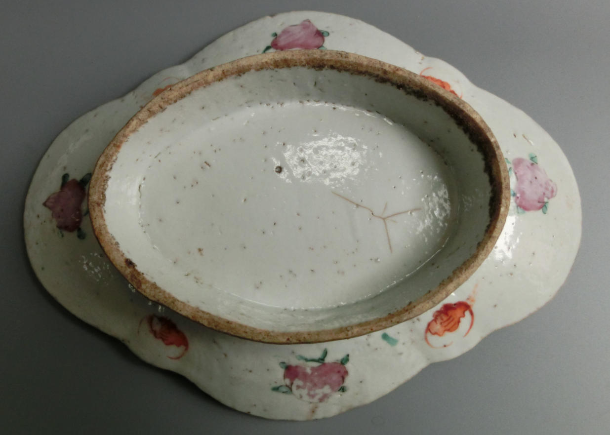 传世美品、造型雅致、清中期神话人物花卉粉彩瓷鸭舌盘,长25.5厘米、宽19厘米、高5厘米,品质保证,实价850元。
