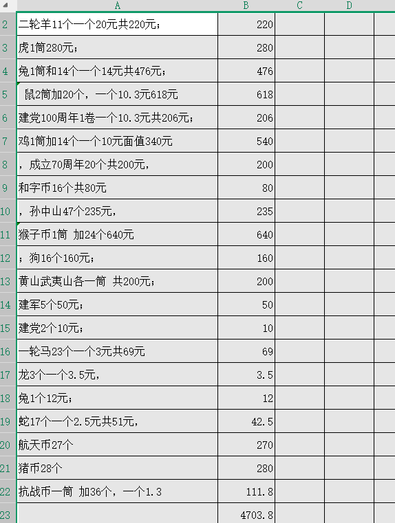 二轮羊11个一个20元;虎1筒280元;兔1筒和14个一个14元; 鼠2筒加20个,一个10.3元;建党100周年1卷一个10.3元;鸡1筒加14个一个10元面值,成立70周年20个面值出让,和字币16个,一个5元面值,孙中山47个面值出让,猴子币1筒 加24个面值出让 ;狗16个面值出让;黄山武夷山各一筒 面值200出让;建军5个50元;建党2个10元;一轮马23个一个3.5元龙3个一个4.5元兔1个14元;蛇17个一个3元,再优惠表 中的价格再少50元