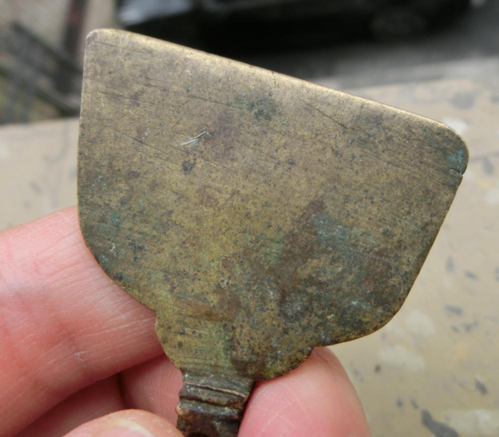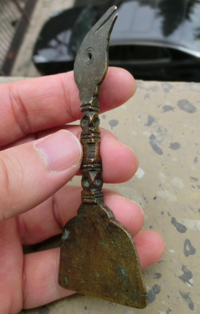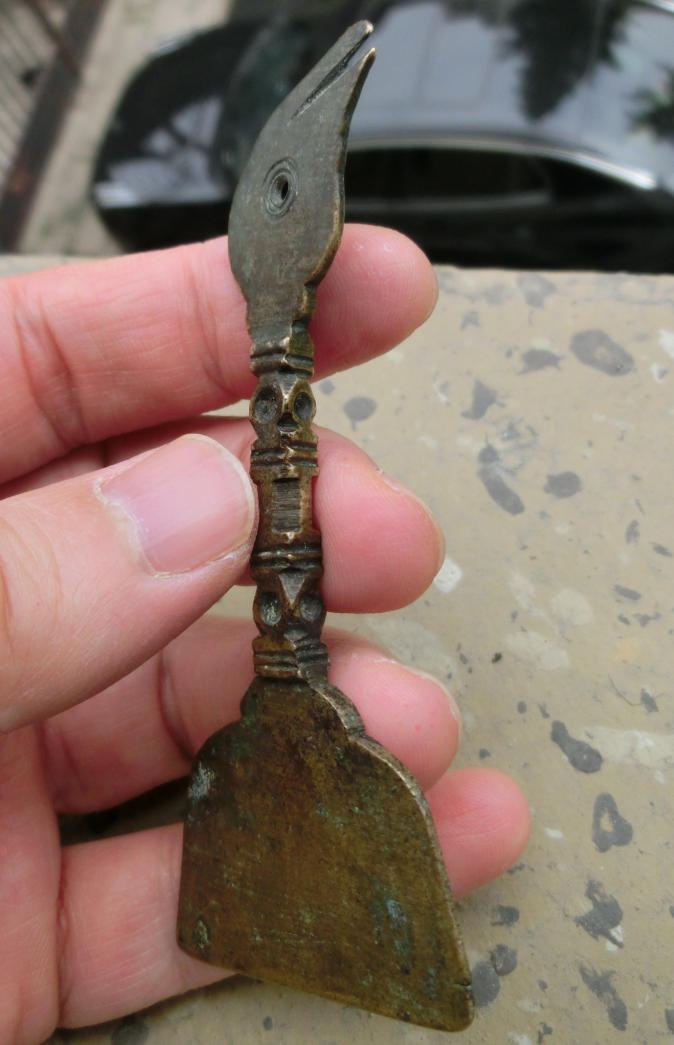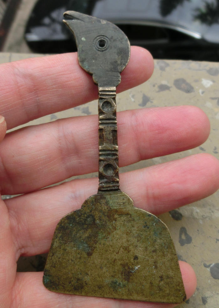 百年历史传承、包浆熟美、清朝黄铜质凤首竹节柄香灰铲,长9.2厘米、宽4.2厘米、厚0.5厘米、重25克,品质保证,实价550元。