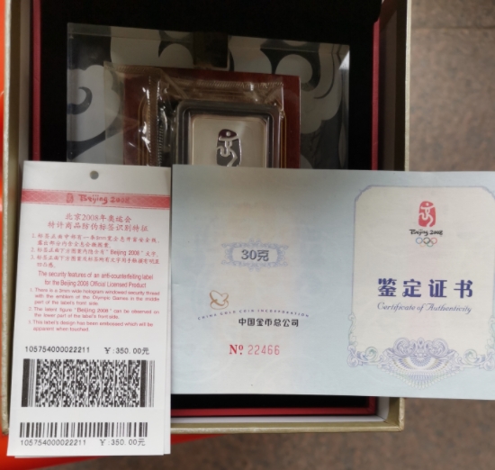 2008年29届奥运会银条 30克。 按18.5元/克。