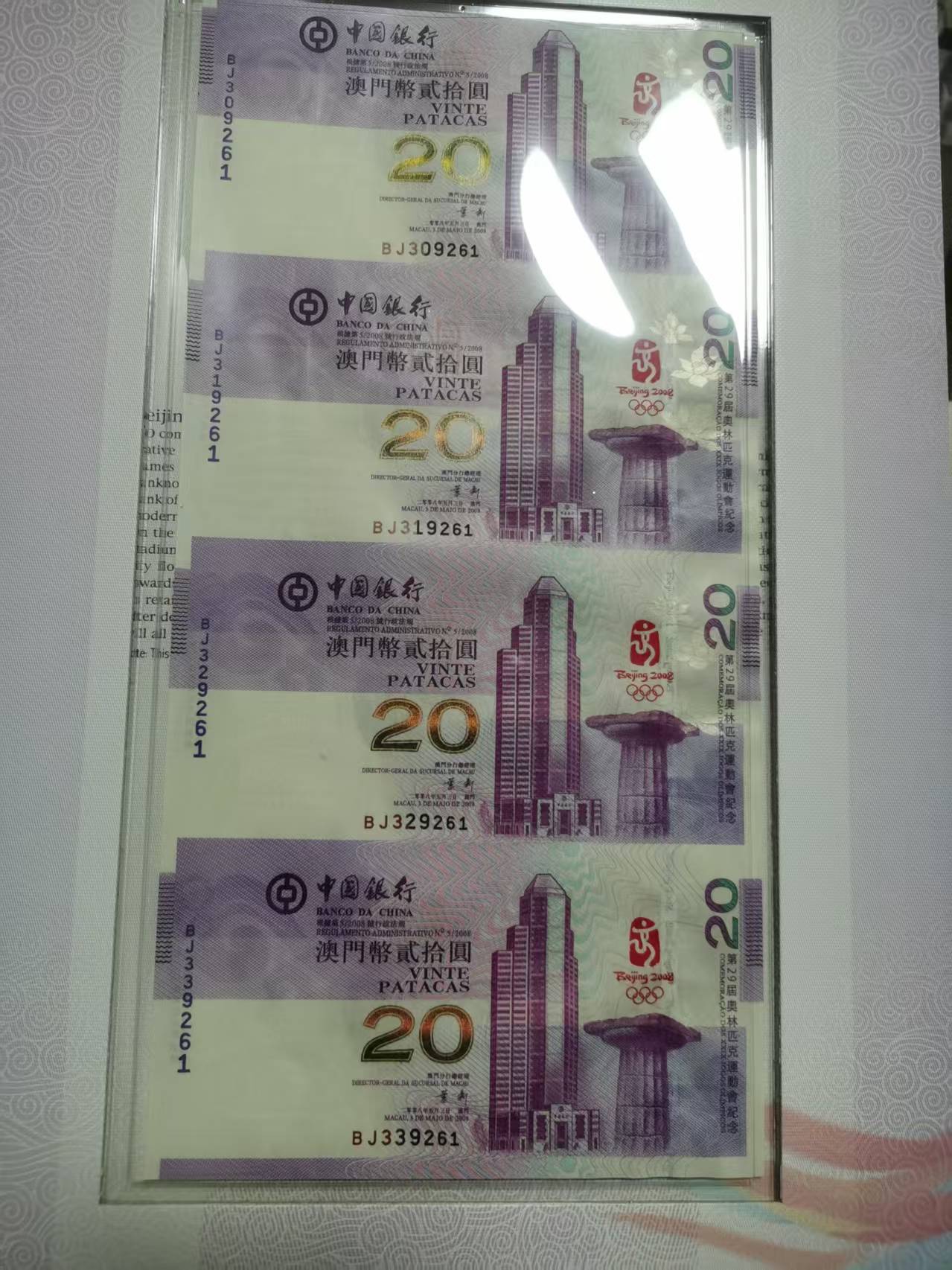 如图:澳门奥运钞四连体无47,4张连号一起走2800元,要册子顺丰到付