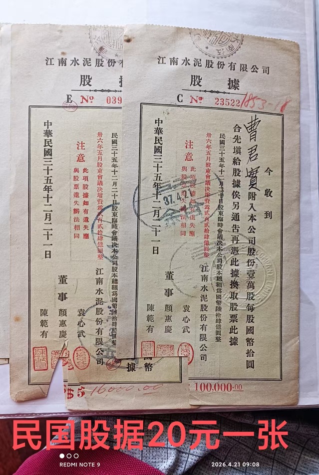 → 售民国时期江南水泥厂股据