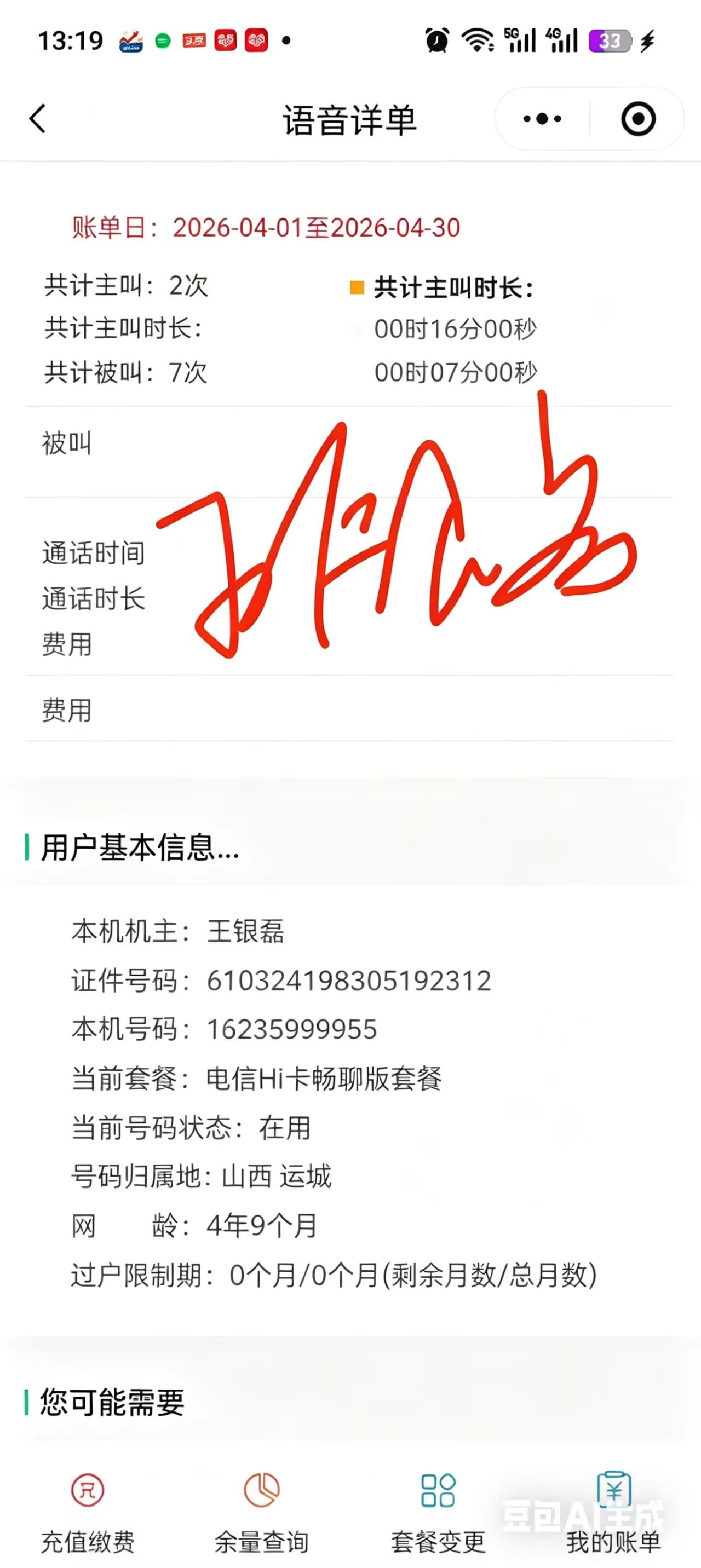 姓名: 王银磊(已通过身份核查,号码一致)