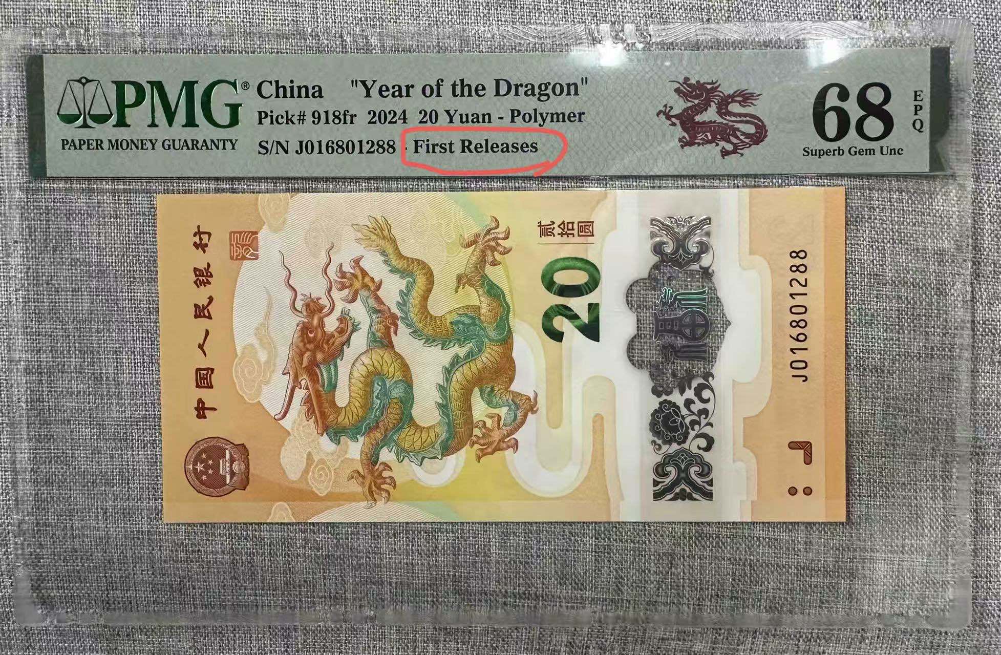 → 016801288龙钞首期标918pmg68分卖3500元